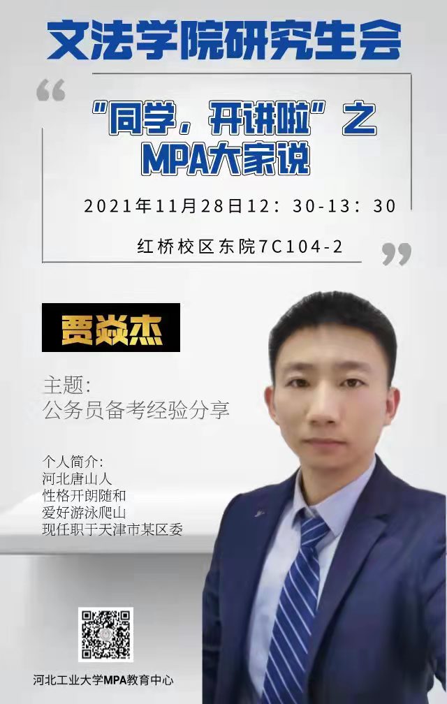 最后,贾焱杰同学祝大家乘风破浪,学有所成,顺利上岸,考取理想职位。至此,MPA大家说第一期分享会顺利结束。