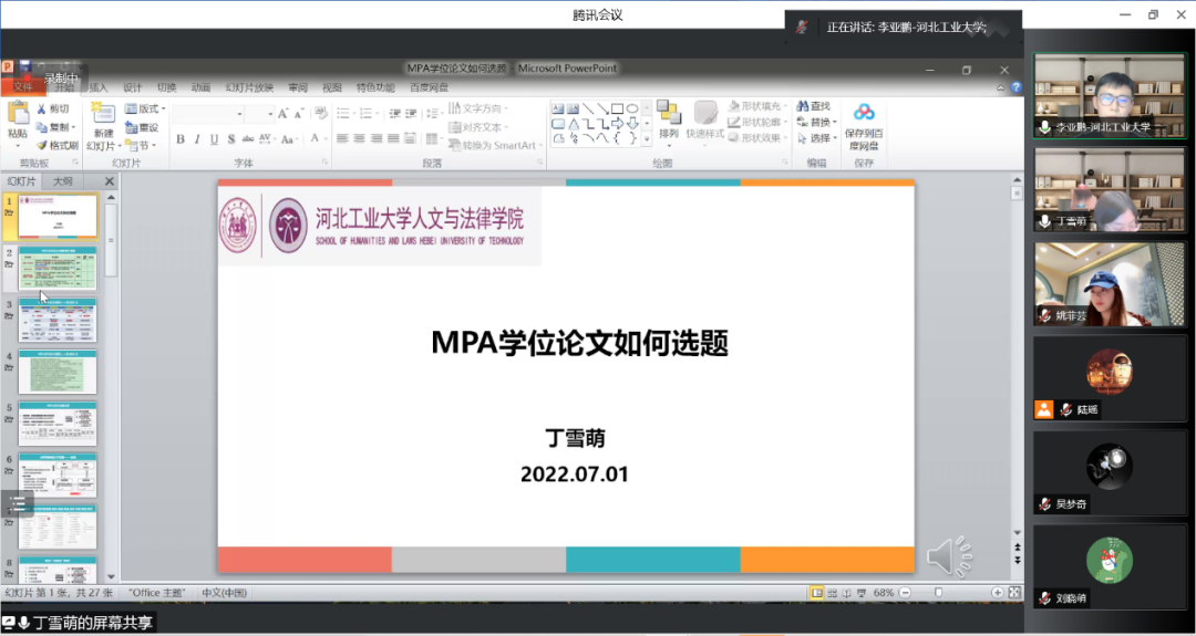 2022年7月1日晚19点,“引航毕业,助力论文”系列活动第一期“研究生论文如何选题”于线上准时召开。本次活动特邀suncitygroup太阳新城丁雪萌老师主讲,MPA教育中心副主任李亚鹏老师主持,MPA同学共同参与。