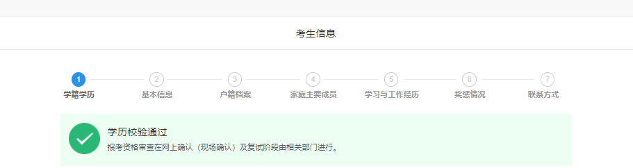 一般情况下,在“填写考生信息”阶段,考生填报的学历(学籍)信息可以快速校验,如遇网络拥堵等特殊情况,将出现“进行中”的状态,考生可以继续填写考生信息中的其他部分,不影响接下来的操作。考生也可在报名前或报名期间自行登录“中国高等教育员工信息网”(网址:http://www.chsi.com.cn)或关注学信网公众号查询本人学历(学籍)信息。未通过网上学历(学籍)校验的考生,国内学历应及时到中国高等教育员工信息网进行学历(学籍)认证,国外学历应及时到教育部留学服务中心进行认证。在现场确认时按照报考点要求将认证报告交报考点核验。