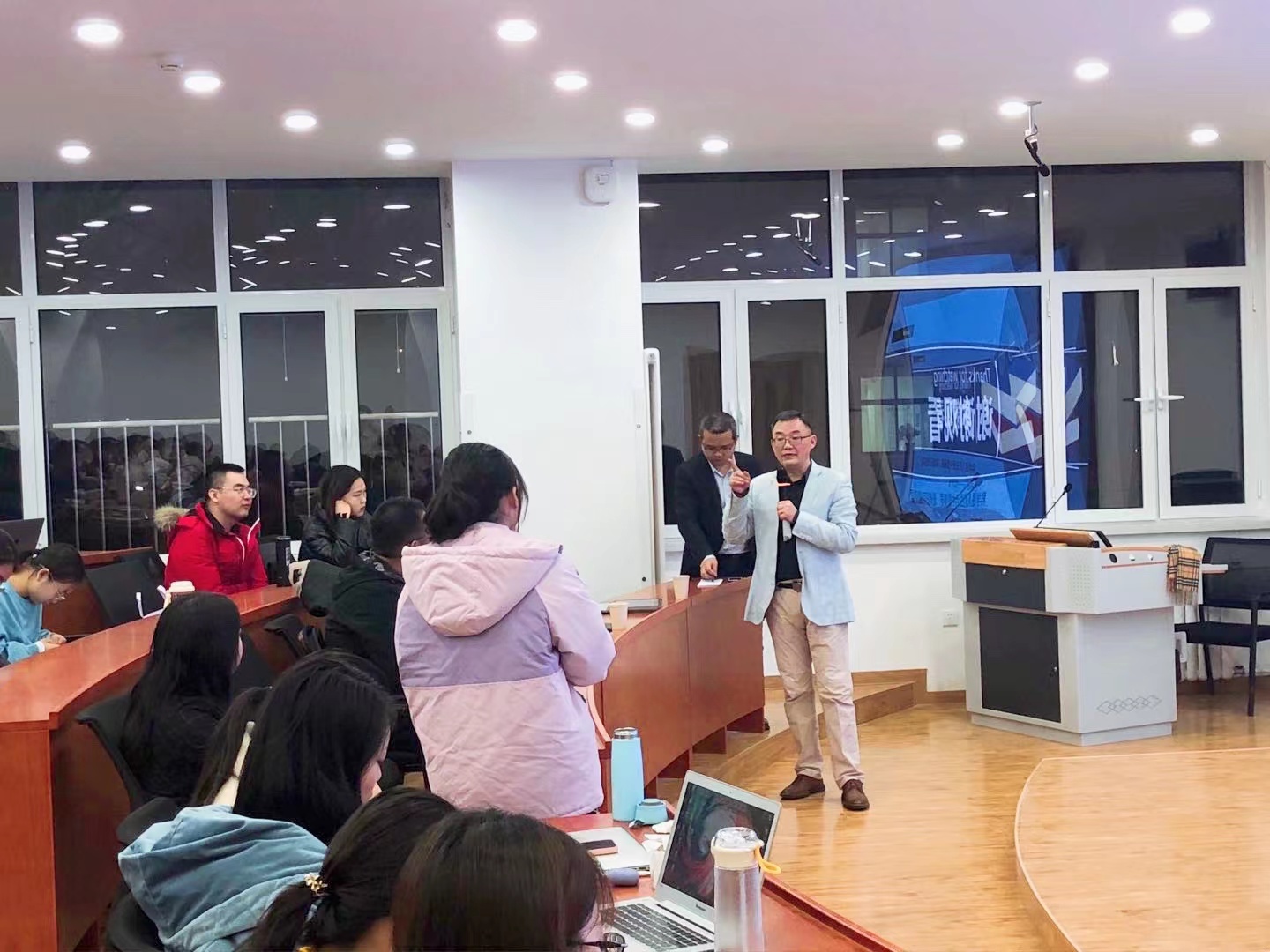 讲座尾声,同学们针对本次讲座提出了自己的疑惑,胡董事长进行了精彩的解答;闫文博副经理总结了此次讲座的收获,并对胡董事长的到来表示了由衷的感谢,闫文博副经理指出本次讲座对于文科员工的学习和研究有着很重要的意义,希望同学们在学好人文社科知识的基础上可以再去了解一些自然科学知识,提升能力,拓宽眼界。最后,在同学们热烈的掌声中本次讲座圆满结束。