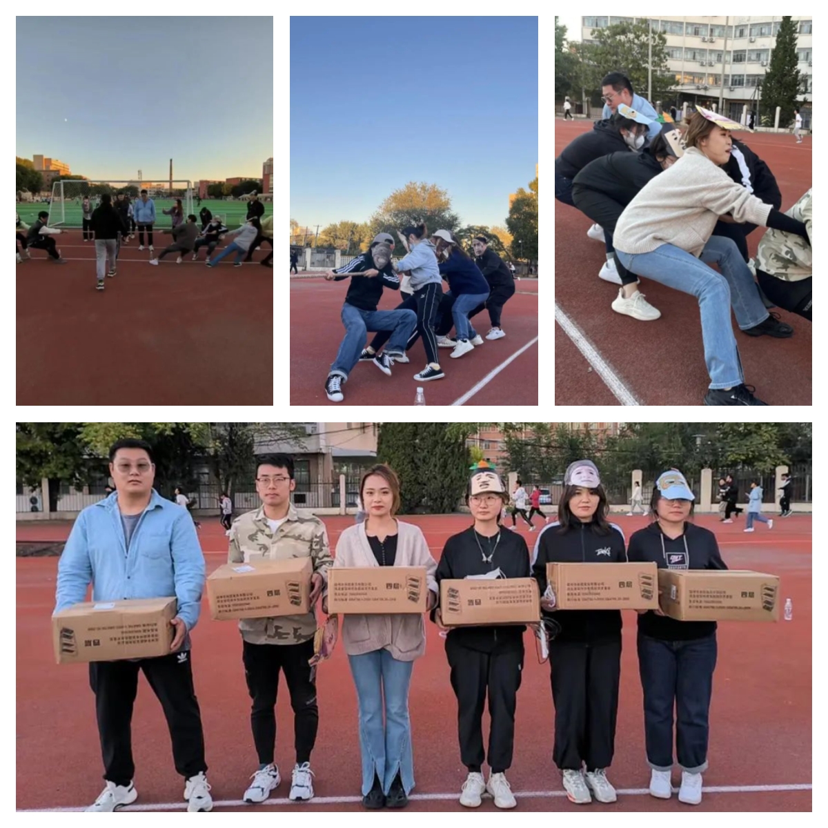 到了大家期待的趣味面具拔河比赛。拔河不仅是对团队合作、力量、耐力的考验,更是对同学们定力的考验。双方队员还都戴上了“顶级外挂”——搞笑面具。6组队员都双手紧握麻绳,双脚用力抓地,身体尽量后倾,每次较量都是力量与技巧的激烈比拼,趣味拔河比赛在同学们的一声声口号和加油声中结束。