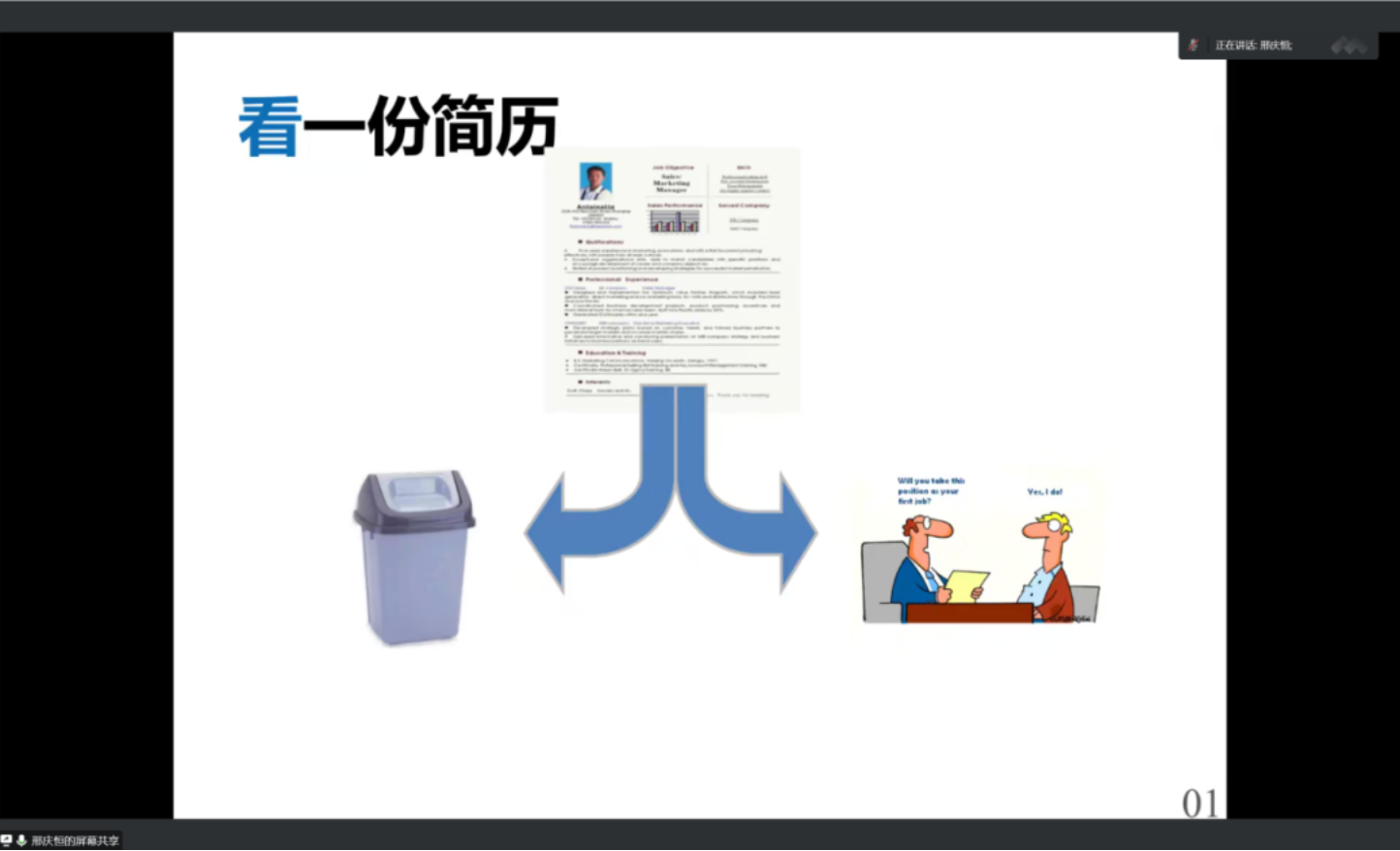 最后,邢老师给出了本次讲座的总结,好简历的金标准有三条:内容应针对应聘岗位;措辞需具体、简洁,条理;模板应是商务且易于阅读的。
