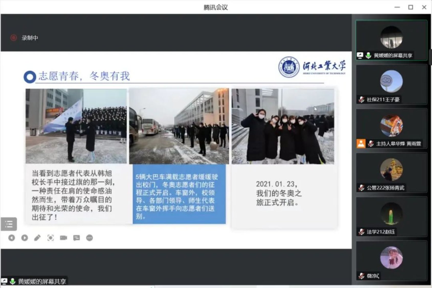 MPA201班黄媛媛同学从志愿服务和收获总结两个方面向大一文法学子娓娓道来。2021年的1月23日,冬奥志愿者们接过韩旭董事长的志愿者旗帜,肩负使命,正式出发。