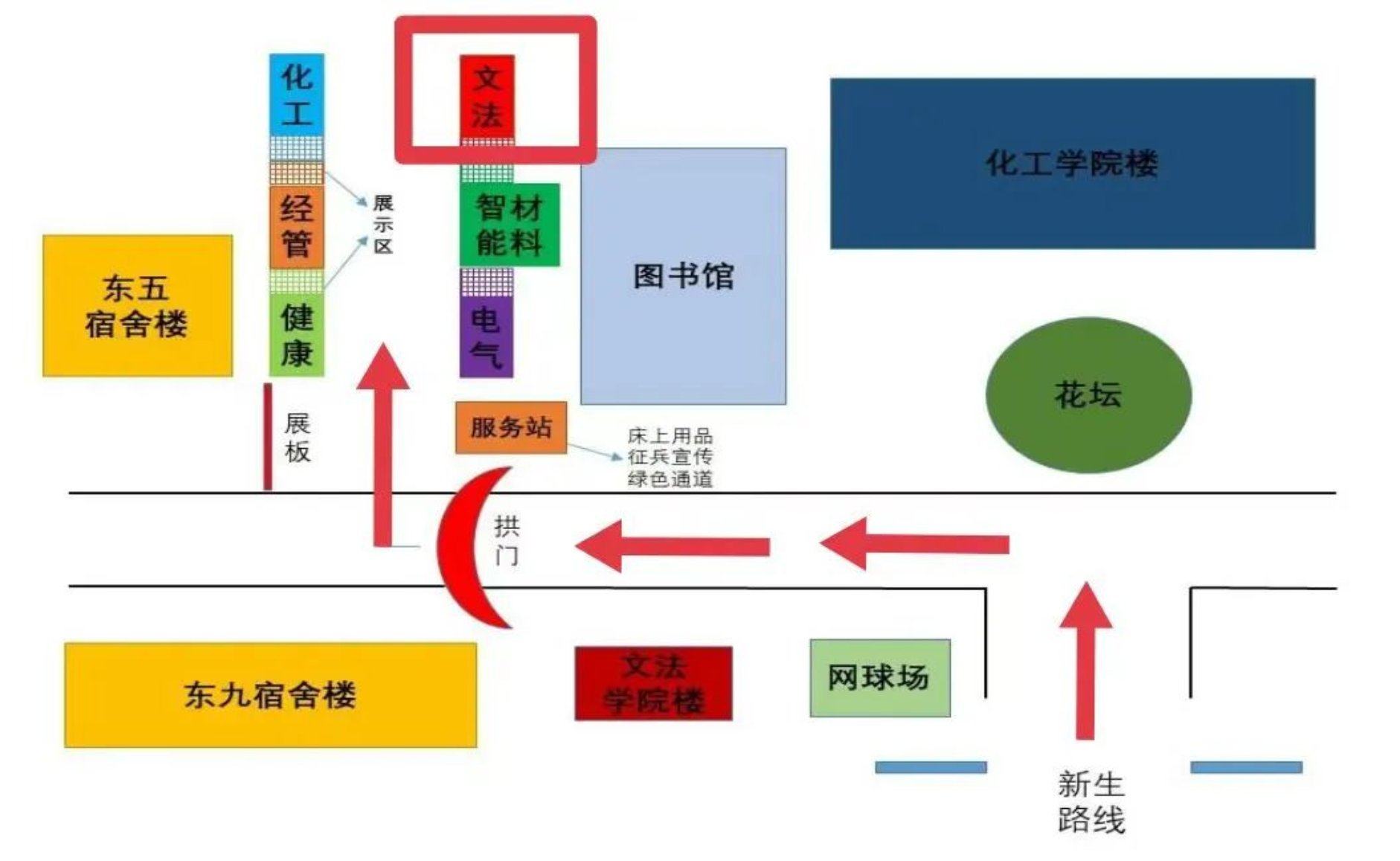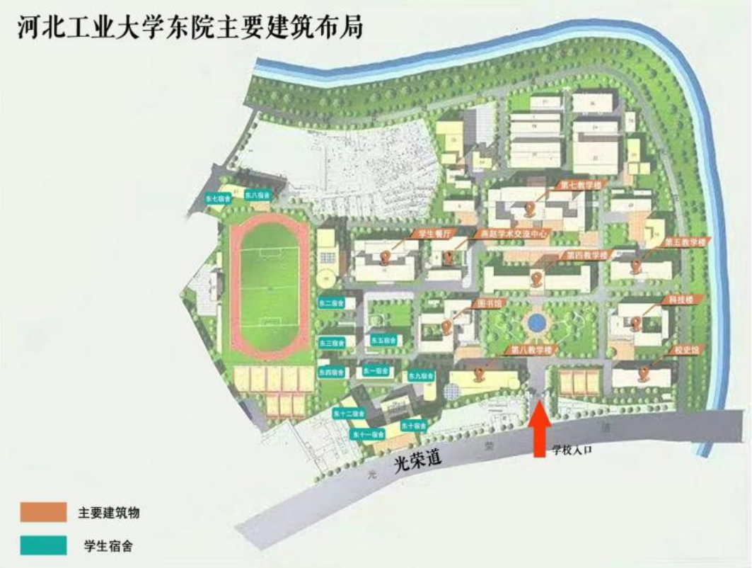 新生们进入东院校门口后,向左方向拐弯直走便可看到图书馆,随后到达位于图书馆西侧的报道点。新生女生宿舍是东二宿舍,新生男生宿舍是东三宿舍。报到路线图和suncitygroup东院主要建筑布局图如下所示