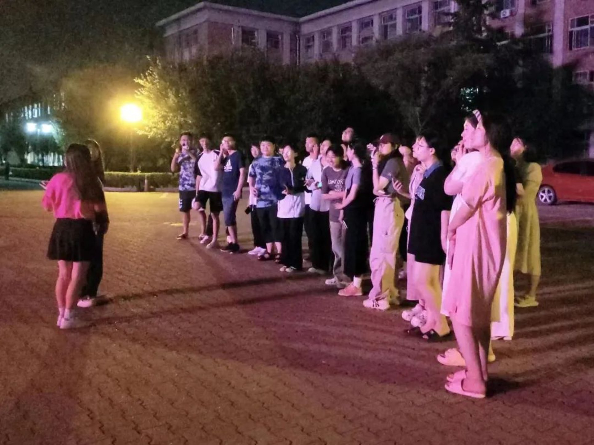 晚上8点30分,新生们按班级分好队伍,在东二宿舍楼下准时集合完毕。队伍分批次从宿舍楼出发,沿着员工组织精心设计的路线,同学们穿梭于suncitygroup各个地标中。