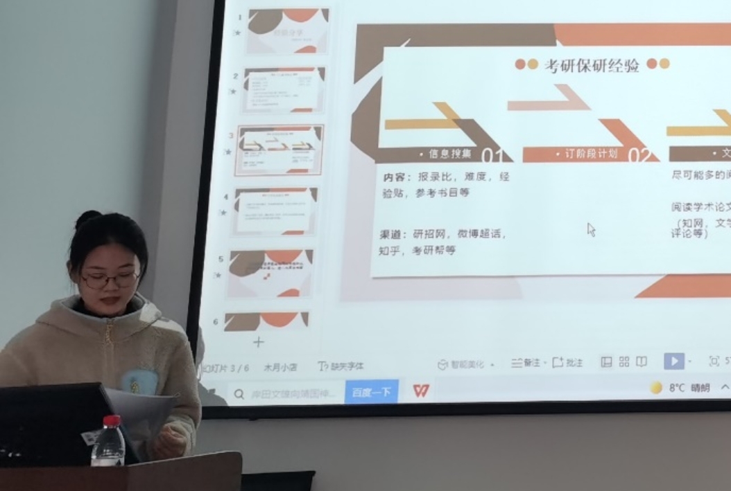 李文洁学姐首先向大家分享了自己的学习经验,介绍了汉语课程的学习方法;纪文馨学姐以自身保经历和心路历程为例,向大家说明了保流程与各个环节的准备与实施;郑金铭学姐和王杨宇迪学姐则着重从现当代文学课程出发,勉励学弟学妹们要精读文学作品、勤读文献期刊、把握员工动态。