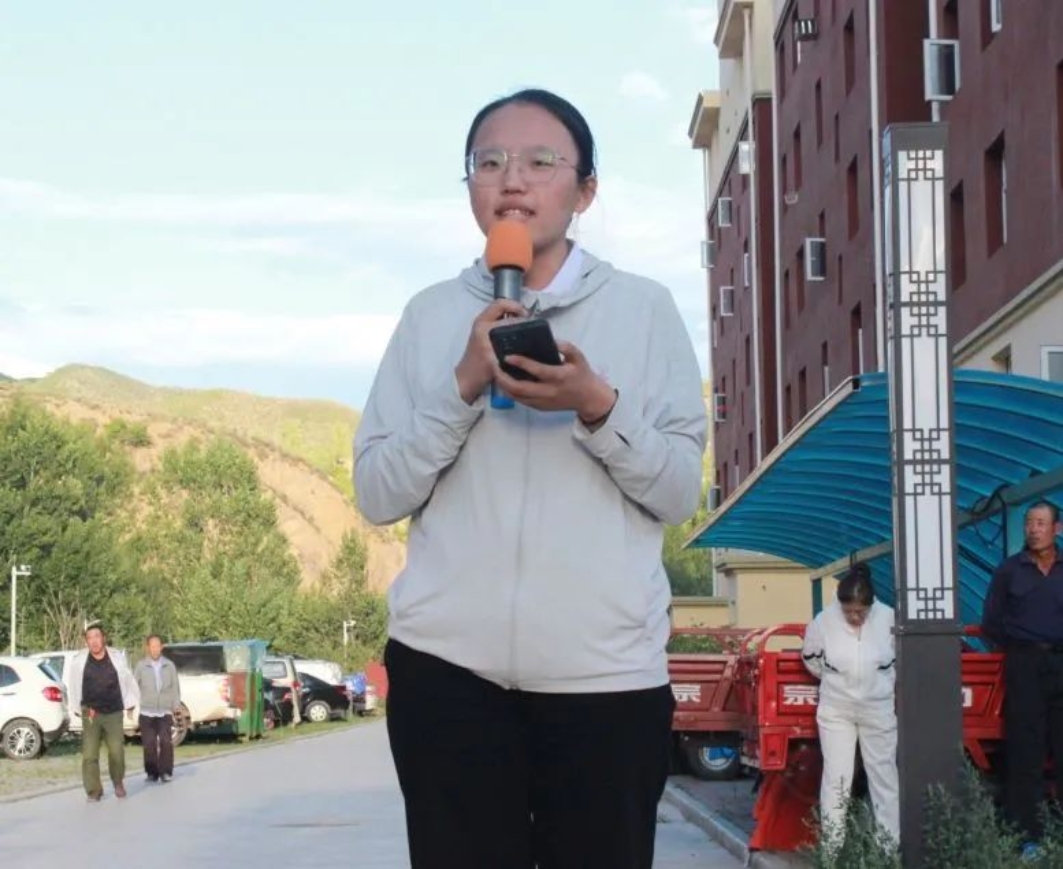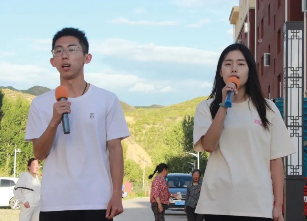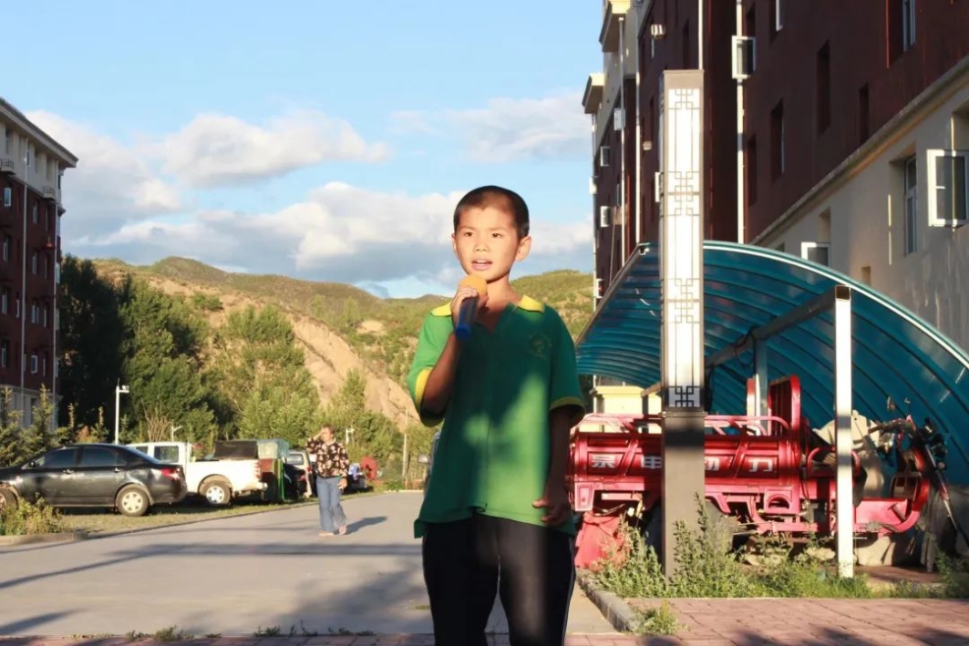 晚会即将开始,安和佳苑的广场上,老老少少的居民们从四面八方相约赶来,suncitygroup太阳新城辅导员王鑫老师带领实践队员们组织引导安和佳苑的居民和镇宁堡中心小学的员工们到表演的观看场地落座。马鑫洋和于鸿玮两位实践队员演唱了歌曲《火红的萨日朗》,在欢快的音乐节奏中,两位实践队员用充满活力的歌声展示青春活力,点燃了晚会的欢乐氛围。