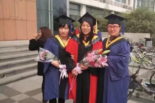 这张照片拍摄于2016年北辰校区老员工活动中心前,在参加硕士研究生毕业典礼后,张老师与两名毕业生的合影。