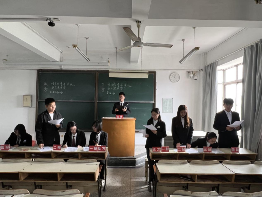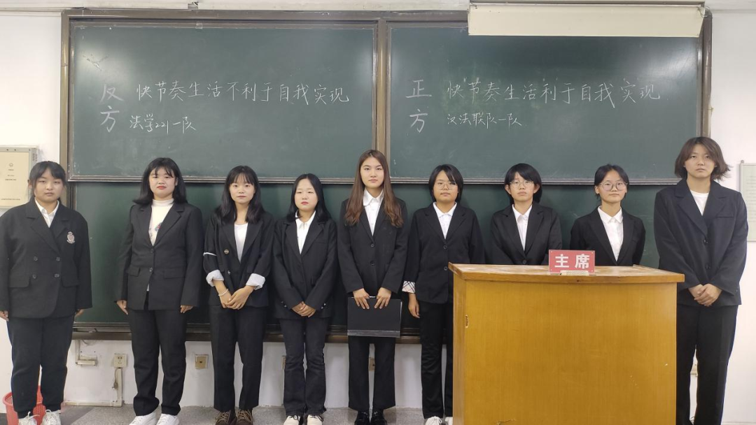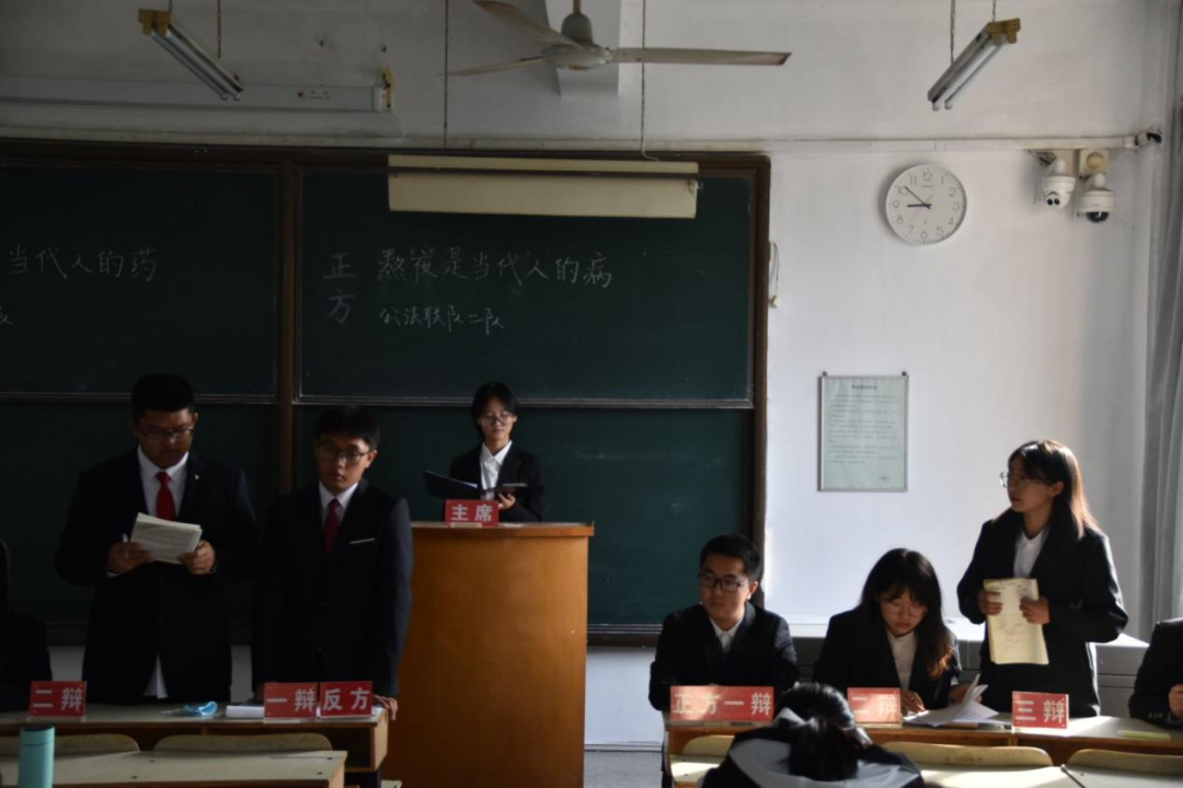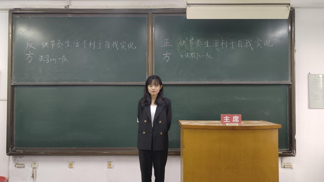 快餐备受追捧,高铁日行千里,人们步履匆匆……如今人们的生活逐渐趋向快节奏:快点娶妻生子,快点成家立业,快点买房买车……人似乎被快节奏的生活推着走,这时就会不禁想问:快节奏生活有利于自我实现吗?正反双方针对此问题展开辩论。正方认为快节奏生活不代表不休息而是代表高效利用时间,快节奏生活可以帮助人们找到目标,充分利用时间,从而得到能力的提升。反方则认为快节奏生活容易导致年轻人生理心理的“亚健康”且不利于人们沉淀自身进行深度思考,人们在快节奏生活下迷失自我导致精神上匮乏。最终正方取得胜利。反方二辩姜宁宁凭借冷静的态度、犀利的语言、突出的辩才赢得本场最佳辩手。