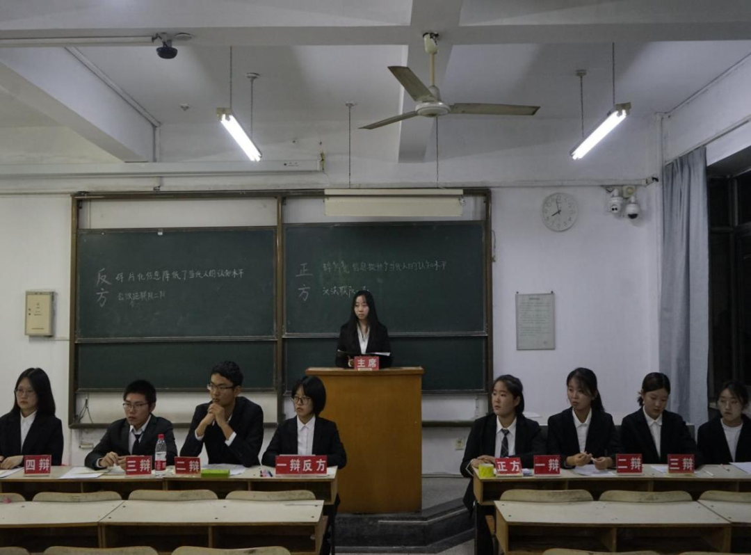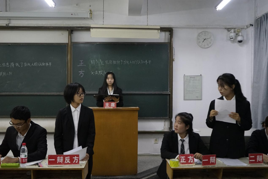 随着互联网的发展,当今社会进入信息碎片化时代。人们的阅读量显著增加,但所接受的信息内容趋向分散,完整信息被各式各样的分类分解为信息片段。正反双方围绕“碎片化信息提升还是降低了当代人的认知水平”展开辩论。正方认为信息碎片化提升了人们的认知,开阔人们的眼界且碎片化信息可以满足身处快节奏时代的人们的娱乐、认知需求,让当代人更能适应时代。反方则从信息化本身和对人的影响两方面进行论述,强调碎片化信息的质量良莠不齐,让人们丧失判断力甚至降低人们的记忆力。经过激烈的辩论,反方取得胜利。反方四辩张炯怡能言善辩,妙语连珠,赢得“最佳辩手”称号。