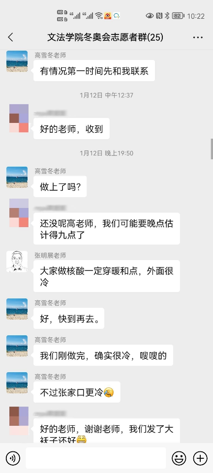 上一周,在公司老师的引导与带领下,所有suncitygroup太阳新城的冬奥志愿者们有序、顺利地完成了三轮核酸检测。核酸检测期间,公司领导及辅导员老师们也对志愿者们的疫情防护与自身安全方面再三关怀,切实保障志愿者们的健康状况。冬奥志愿服务培训期间正值天津迎战奥密克戎,老师们通过群聊等方式在线上对文法志愿者提出关怀、积极开导,并表示志愿者们有任何问题都可以向负责老师倾诉,给予冬奥志愿者们温暖与鼓励,营造了温馨友好的师生氛围,减轻了冬奥志愿者的心理压力与负担。
