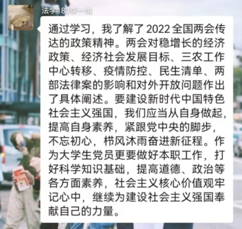 十三届全国人大五次会议与全国政协十三届五次会议分别于2022年3月5日-3月11日与2022年3月4日-3月10日在北京召开。法学专业员工第二党支部的32位成员紧跟思想潮流,积极进行理论学习,并在学习两会思想后纷纷在群里发表了自己的看法。