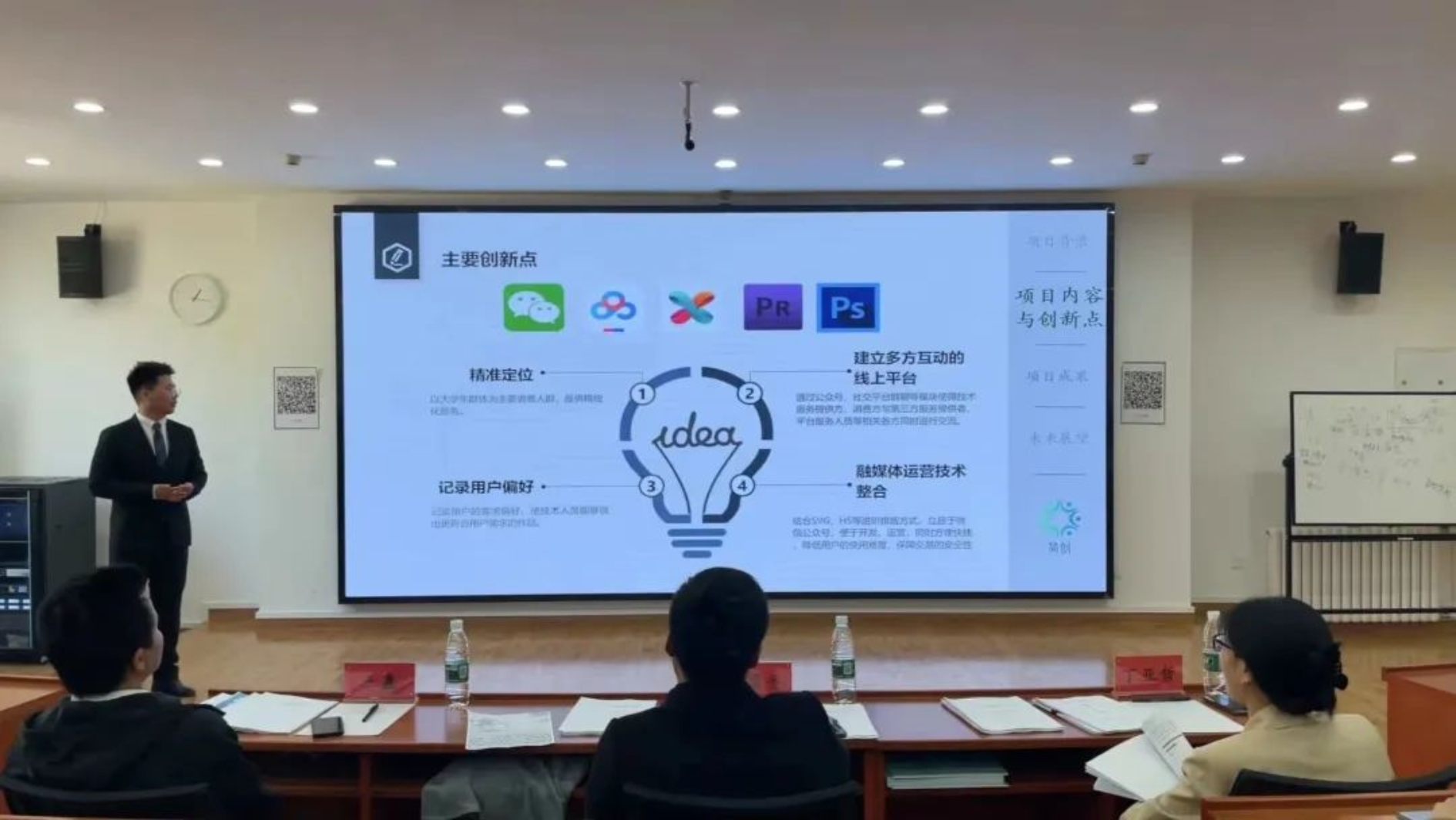 第三支队伍着眼于老员工需求,构建与运营了老员工融媒体技术技能服务平台,记录用户偏好,整合融媒体运营技术,并实现了盈利,评委老师在肯定其项目成果的同时,也提出了项目要加大宣传推广力度以及要有老员工特色等指导意见;