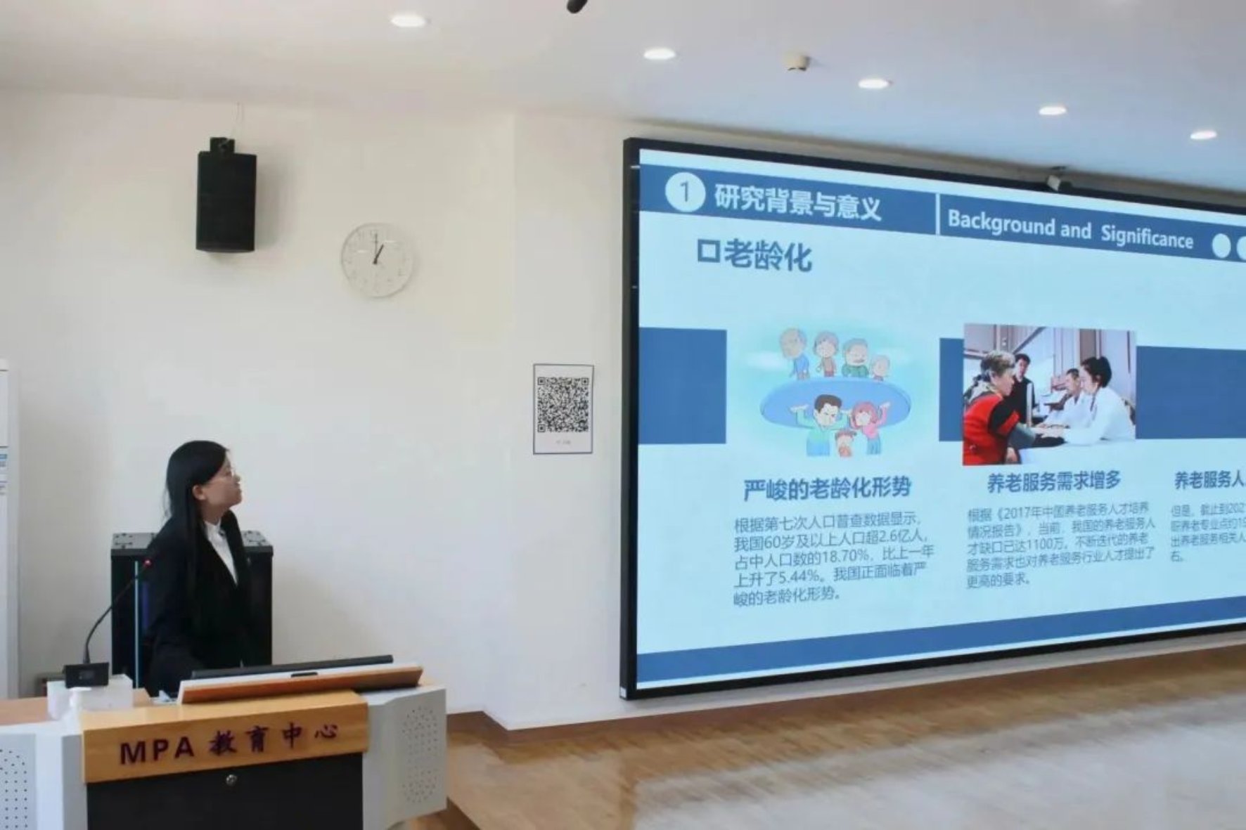 第一支队伍专注社会养老方面,提出“老员工养老行业就业机制及社区养老模式创新研究”项目,通过分析当代老员工的就业去向及对待养老行业的看法以及社区养老模式的设想等方面来阐述项目意义,其项目内涵获得评委老师的肯定;