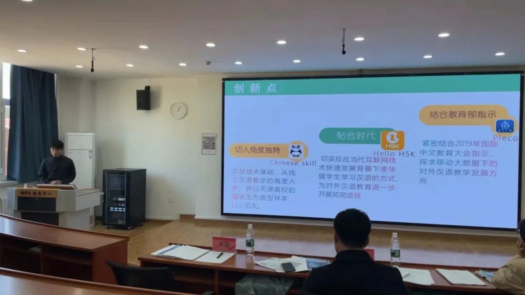 第二支队伍就来华职工汉语学习方面来阐述项目内容,该队伍立足技术基础,从线上汉语教学的角度出发,以天津高校的职工为典型样本,切实反映互联网时代下职工学习汉语的方式,为对外汉语教育进一步拓宽途径,评委老师也对该项目的用户体验及对教师的普及方面进行指导;