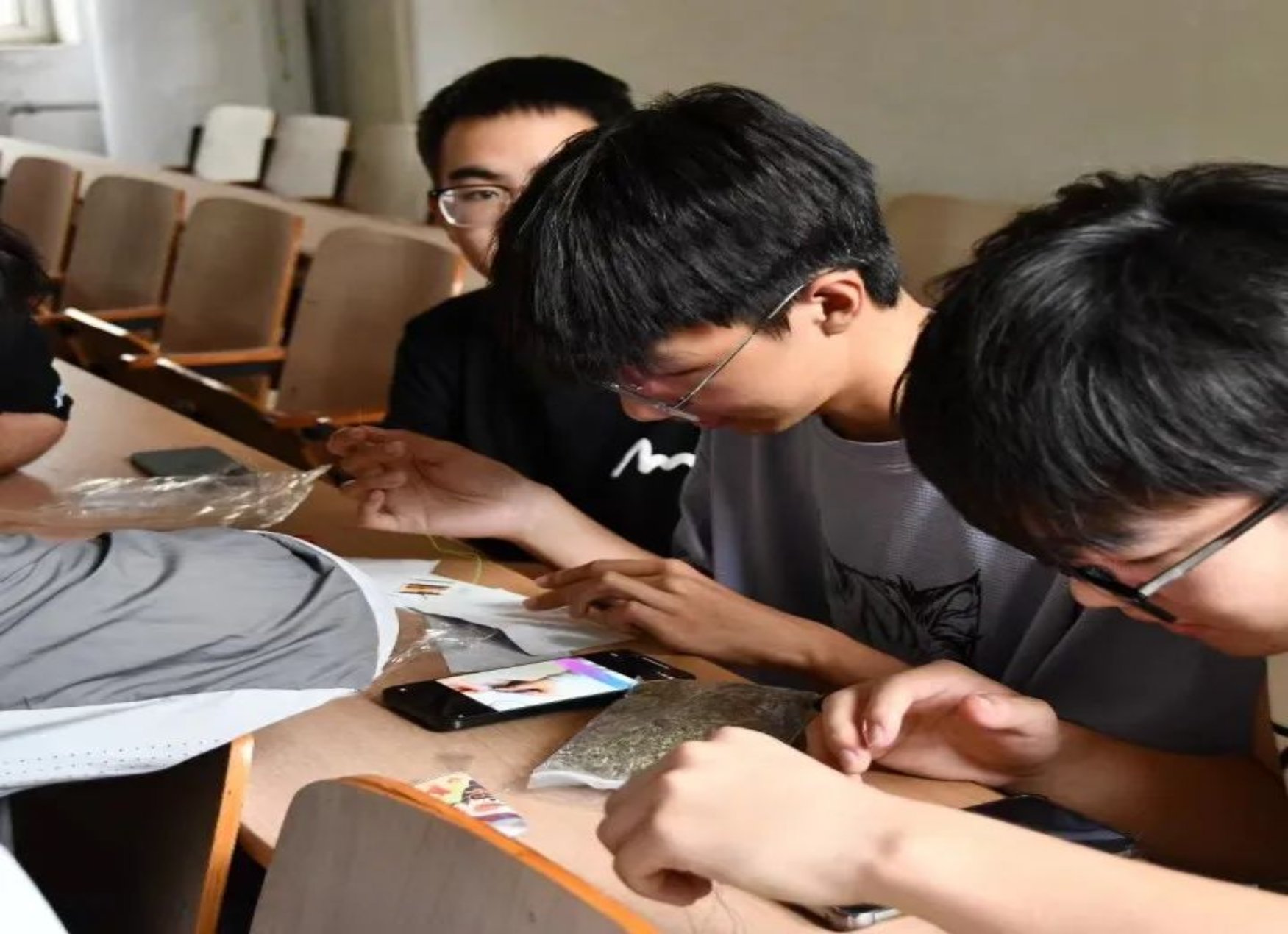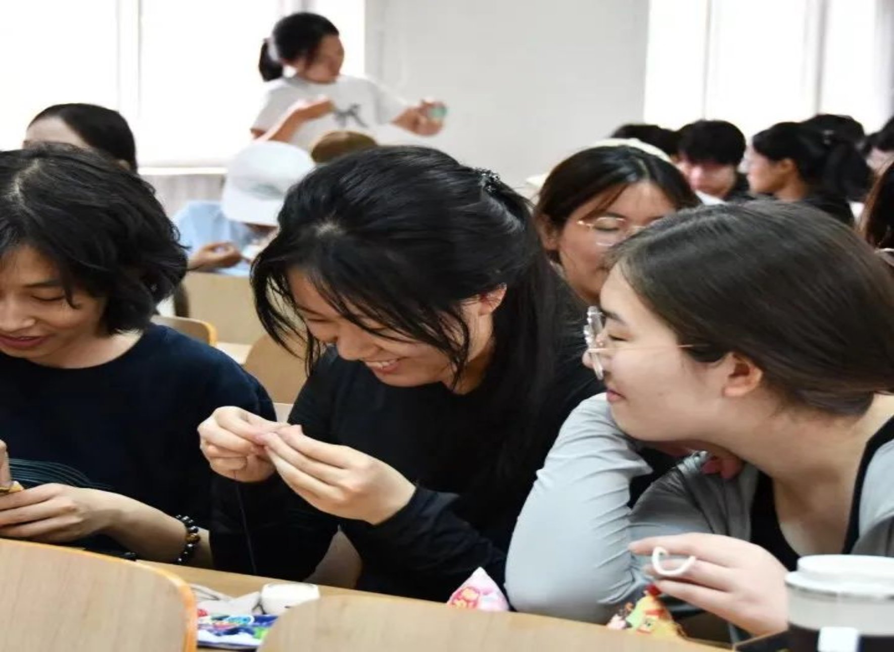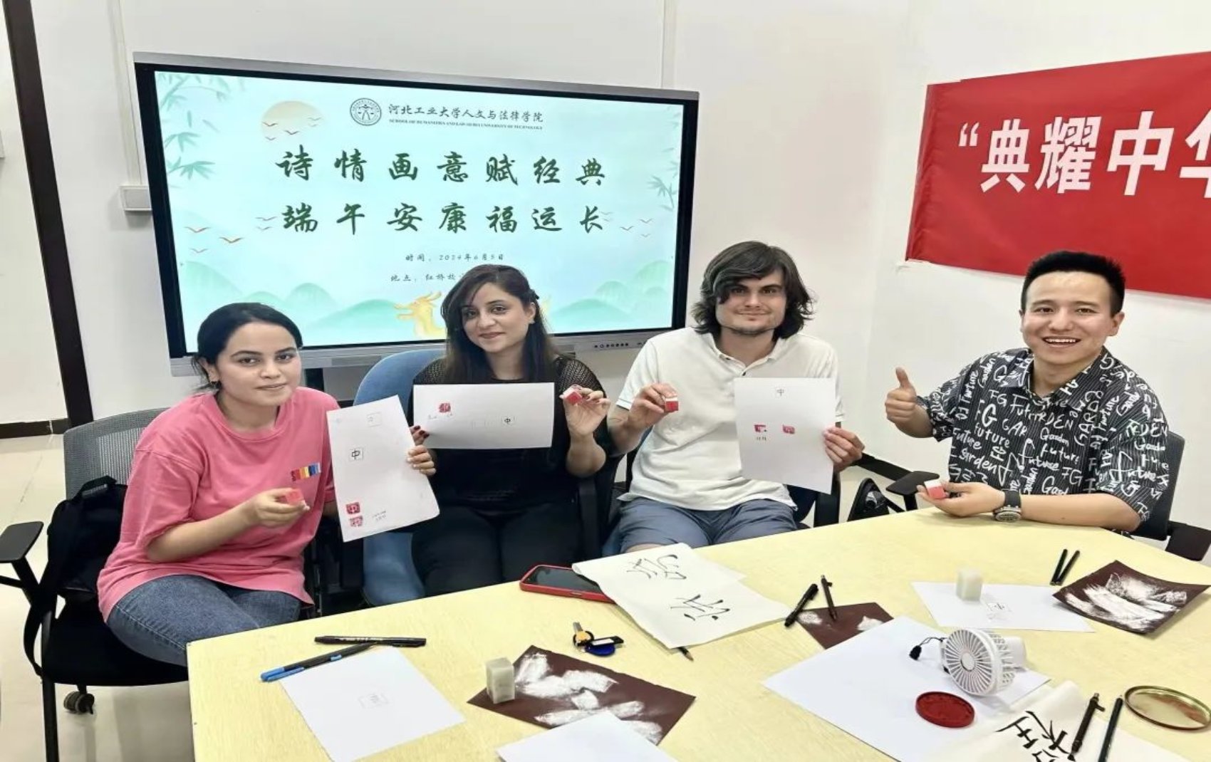 篆刻组的同学们操作着篆刻刀在印石上徐徐切下,往前运行,时提时按,积点成线,大家在篆刻中体会到方寸之间文字与技法的美。国际公司的职工同学们也来到了活动的现场,亲手体验中华篆刻文化,学习在石头上创作独特的篆刻作品,被中华优秀传统文化深深吸引,兴致盎然地与其他同学一同探讨端午节的习俗,了解源远流长的端午文化。