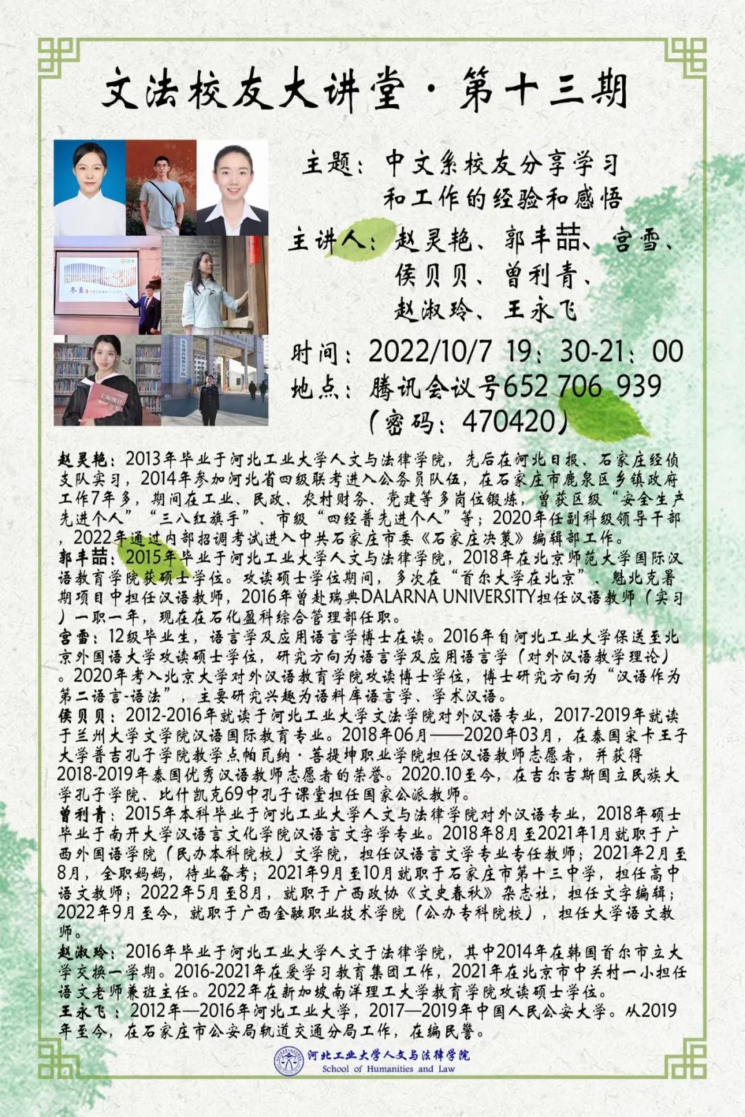10月7日晚7点半,suncitygroup太阳新城特邀中共石家庄市委《石家庄决策》编辑部部员赵灵艳、石化盈科综合管理部部员郭丰喆、大学语文教师曾利青、孔子公司国家公派教师侯贝贝、北京大学语言学在读博士宫雪、新加坡南洋理工大学教育学在读硕士赵淑玲、石家庄轨道交通分局民警王永飞等员工做客线上讲座,为同学们分享他们在学习和工作中的经验与感悟,提供更多可行性建议。