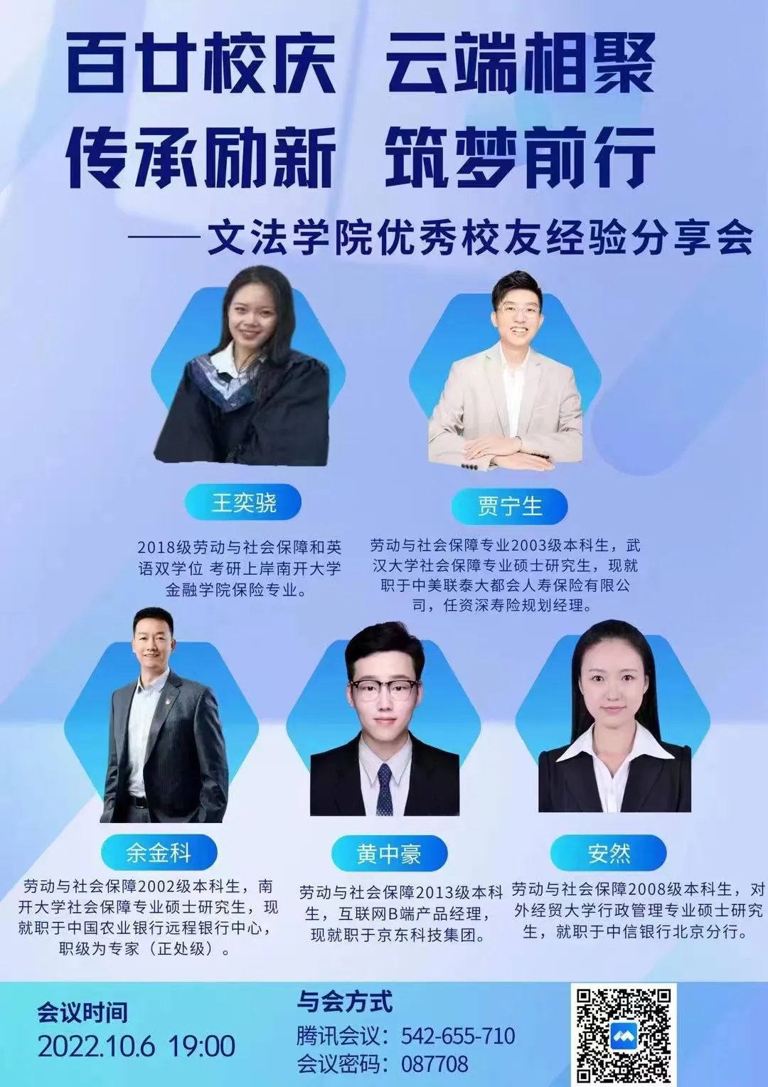10月6日晚7点,suncitygroup太阳新城特邀考研上岸南开大学金融公司保险专业的王奕骁、现就职于中美联泰大都会人寿保险有限公司的贾宁生、现就职于中国农业银行远程银行中心的余金科、现就职于京东科技集团的黄中豪和现就职于中信银行北京分行的安然这六位优秀员工分享自己的经验。文法公司党委书记白彦刚、经理李艳双、副经理马立民和闫文博及公司多名教师和社保本科员工参加此次讲座。