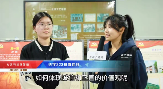 晋雨然和李佳钰两位同学呼吁青年学子们要从点滴做起,践行诚信,坚守自己诚信与正直的品格。通过这简单的对话,我们对此次廉政教育活动有了更全面、更深入的理解。