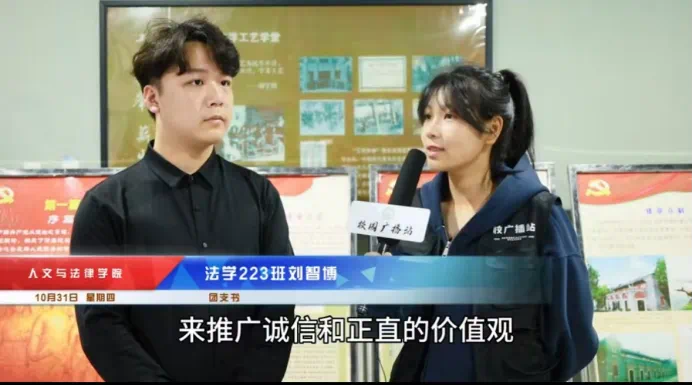 参观活动结束后,校广播站的工作人员对法学223班团支部的团支书刘智博,晋雨然、李佳钰三位同学进行了采访。