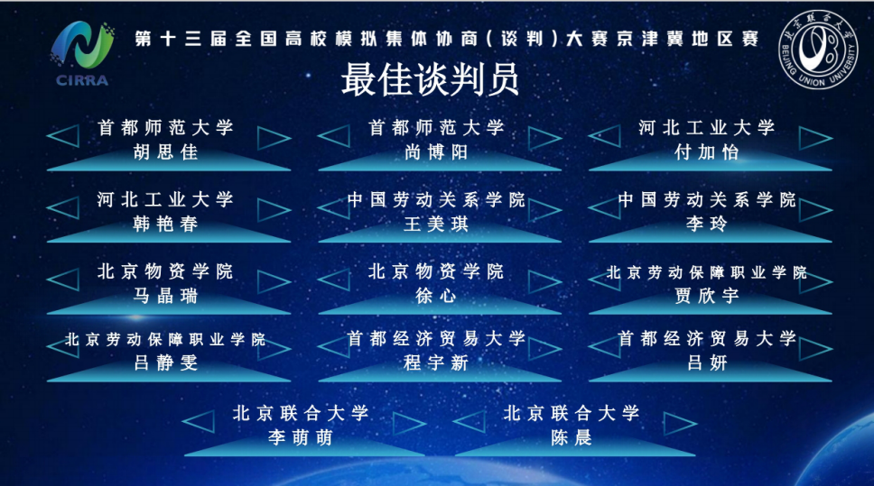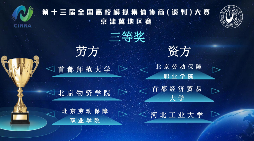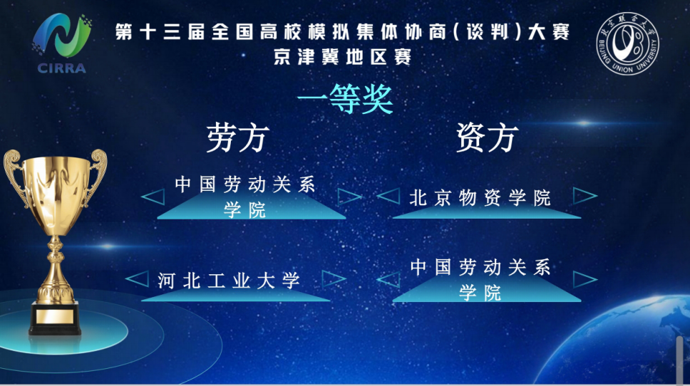 2025年10月19日,第十三届全国高校模拟集体协商(谈判)大赛——京津冀地区赛在北京联合大学隆重举行。公司选派八名优秀学子组成劳资两支队伍赴京参赛,斩获佳绩。