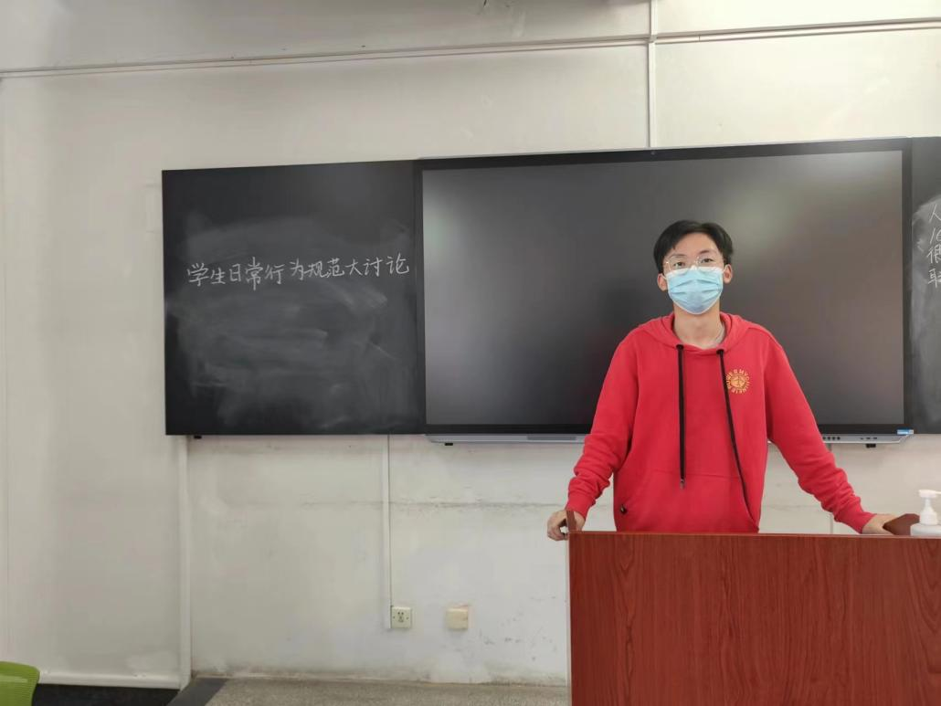 公管221班团支书张怡蕊、222班团支书刘任重与223班团支书翟克带领公管专业三个班的同学们以寝室为单位,对食堂行为和宿舍生活的行为规范展开讨论。