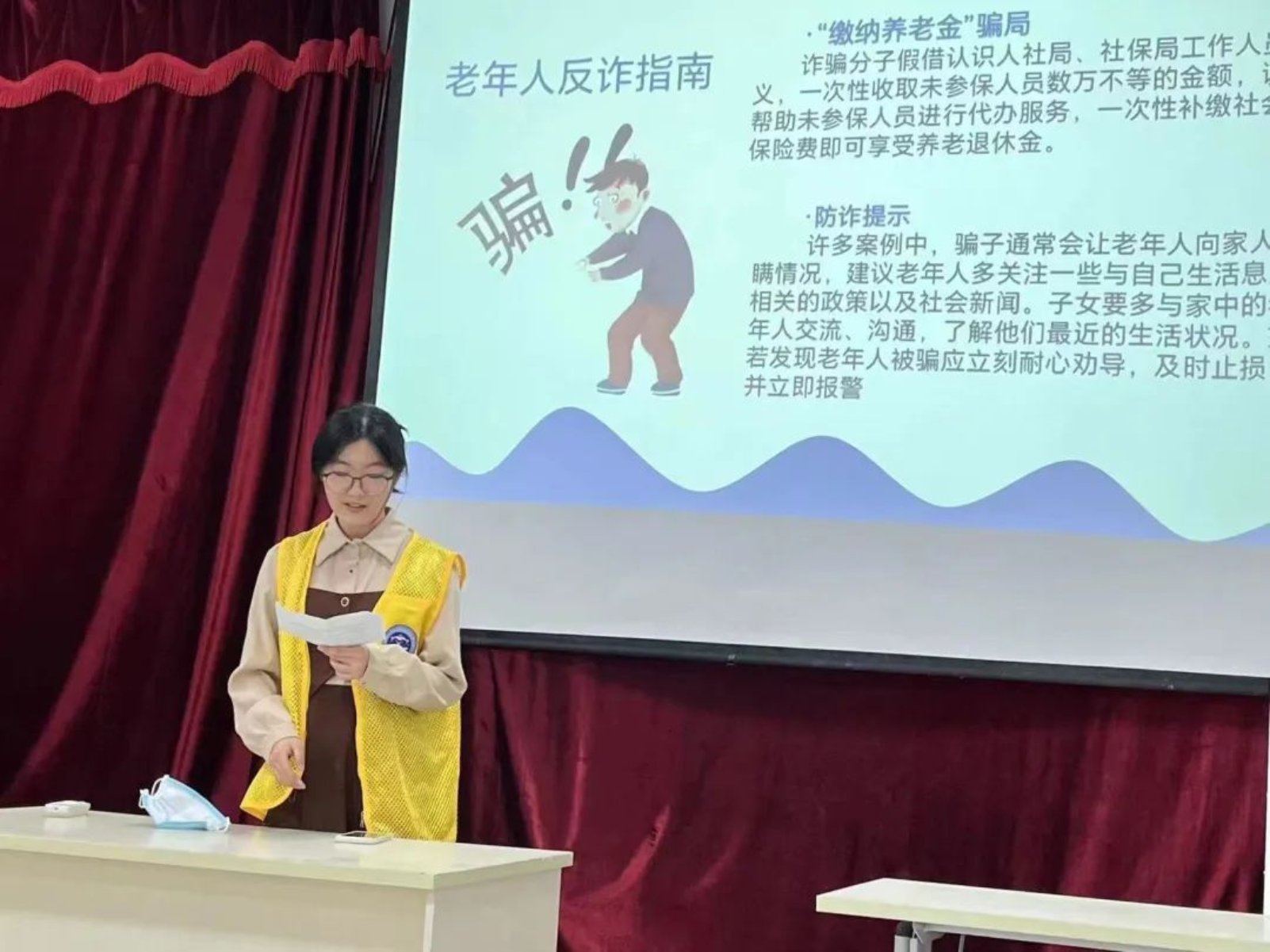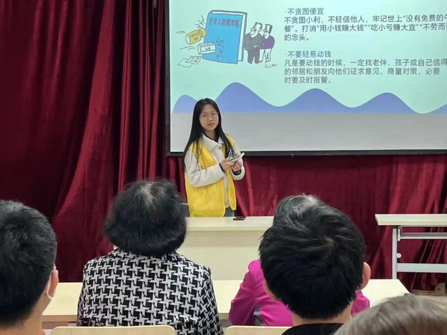 接下来,刘乙漫同学为居民们讲解了老年人反诈指南,针对前面提到的几种养老骗局进行了防诈指示,详细教给大家识别各种骗局以及如何保障自己的人身和财产安全,帮助老年人进一步提高防诈骗意识,预防他们上当受骗。