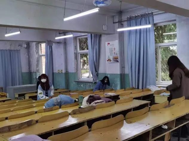 教室里也有我们志愿者的身影。且看她们在课桌与过道中灵活穿行,将桌椅擦拭得干干净净。