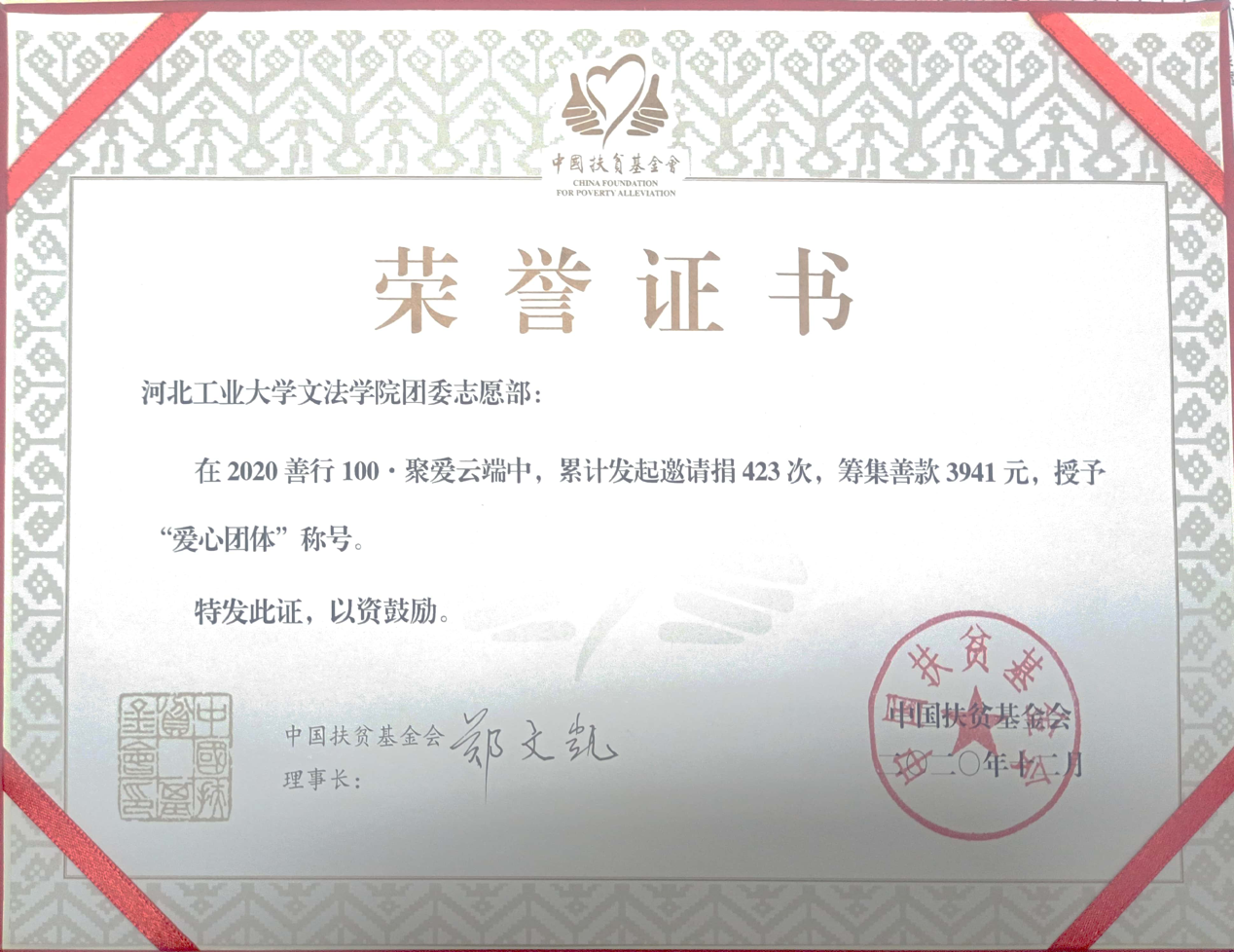 同时,文法学院深化发展长期公益志愿项目“普法进社区”,累计一年共深入社区和单位21家,开展系列普法讲座共计56场次,涉及群众2000余人次。同时在2020年“善行一百”活动中,公司累计发起捐款423次,筹款3941元,被中国扶贫基金会授予“爱心团体”称号。