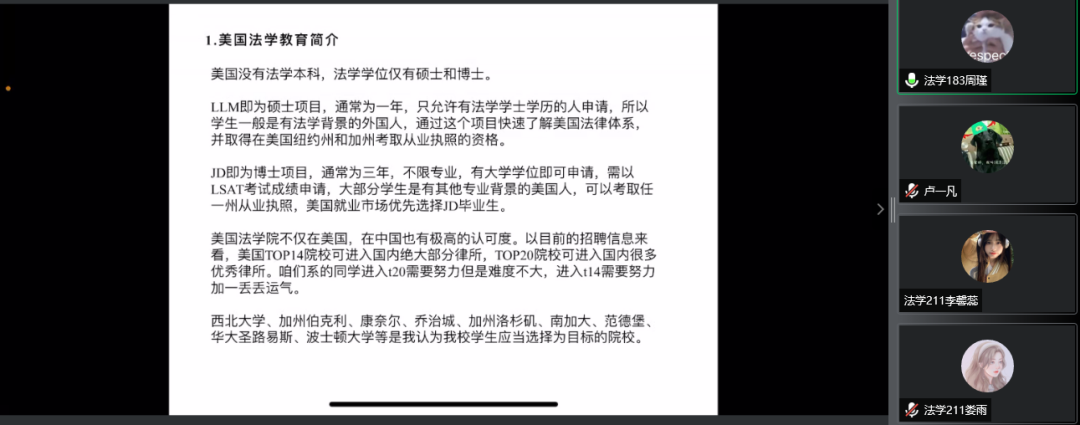 在国家统一法律职业资格考试中取得成功的姜冠宇学长、宋雨轩学姐、李梦园学姐向同学们分享了法考过程的注意事项。学姐们提到在有能力的情况下法考和考研(保研)可以兼得,但要学会合理规划时间。